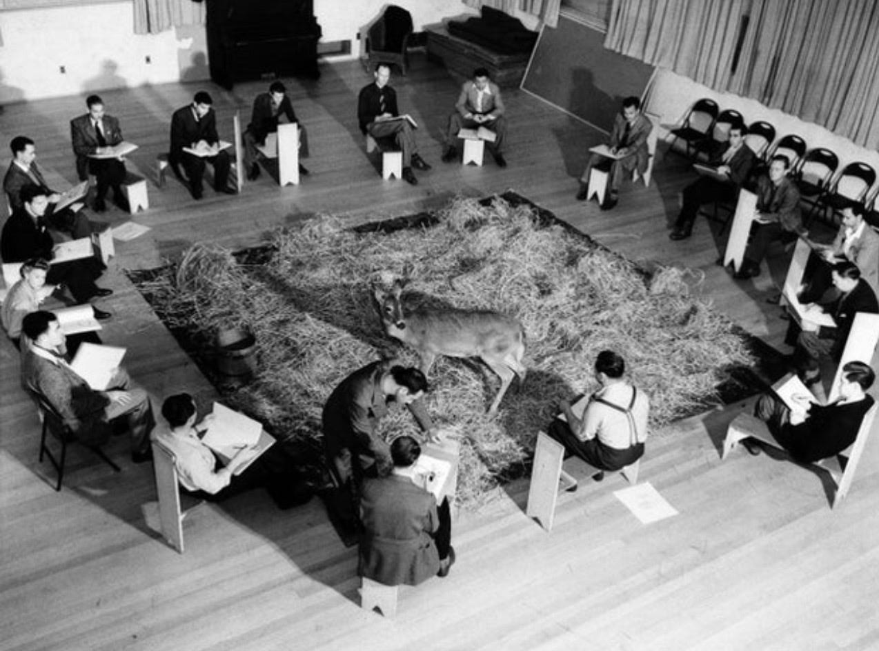 I think what’s going on in that older-looking black and white photo is a drawing class o with students (dressed far more formally than today) practicing drawing a live deer.