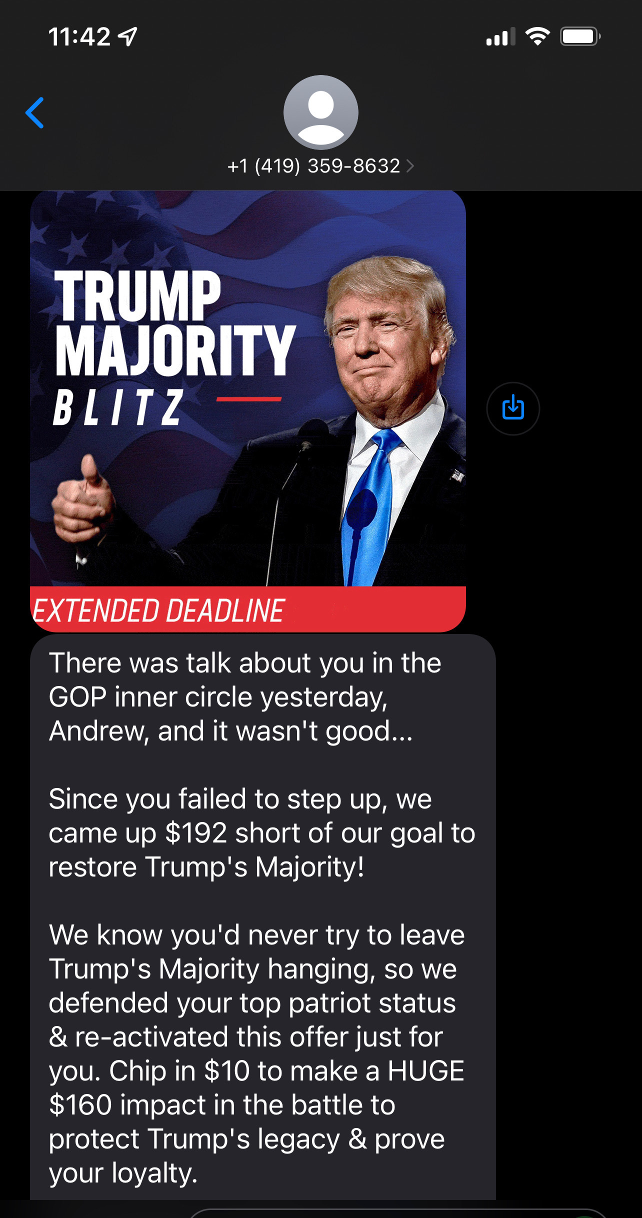 Once I got a message from “Trump Majority Blitz,” with the following, “There was talk about you in the GOP inner circle yesterday, Andrew, and it wasn’t good…” That comes very close to intimidation, no? That was sent before the 2022 election, so in the photo of Trump he is still smiling.