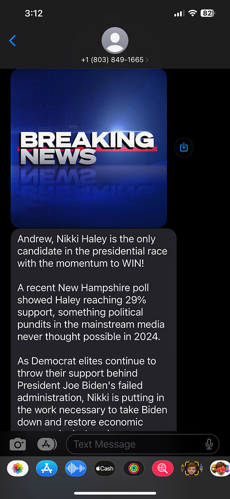 Another time the text message was ridiculously false; “Andrew, we didn’t expect this from YOU! You’re the ONLY person to not sign the petition to DROP ALL CHARGES against Trump.” I bet Joe Biden didn’t sign it.